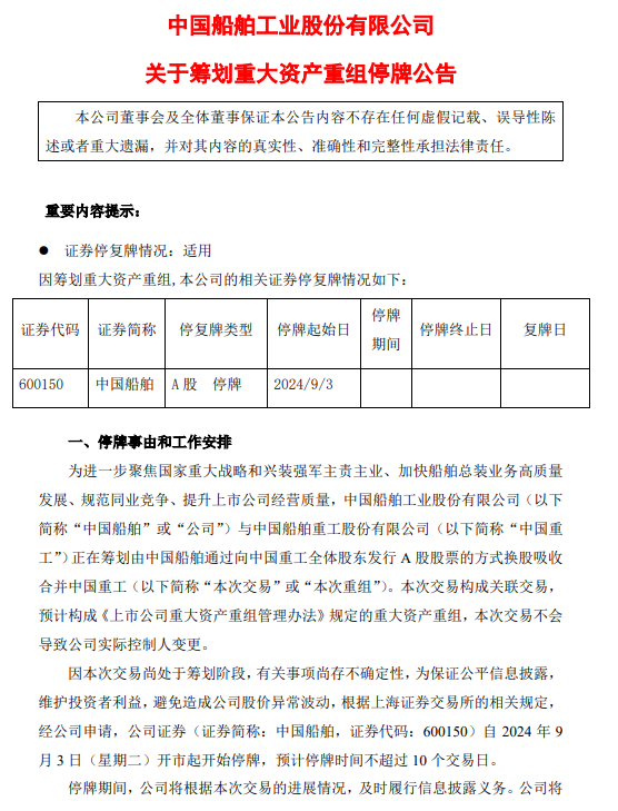 2024年9月2日晚,中国船舶集团下属两家A股上市公司——中国船舶和中国重工均发布公告称,双方正在筹划由中国船舶通过向中国重工全体股东发行A股股票的方式换股吸收合并中国重工。去年9月3日起两家公司的股票均停牌,预计停牌时间不超过10个交易日。